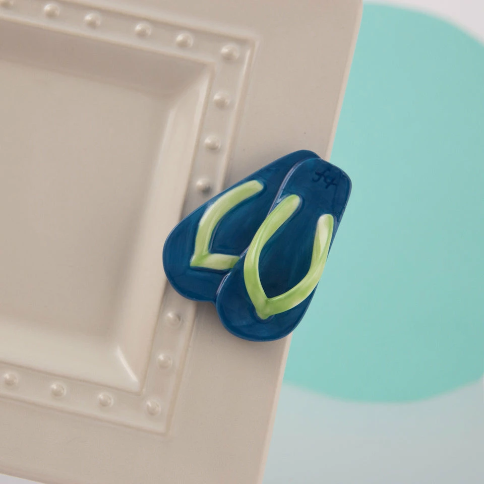 Mini green and blue flip flop pair.Β Nora Fleming minis can be inserted into Nora Fleming bases and switched out to match any occasion or event you might be hosting!