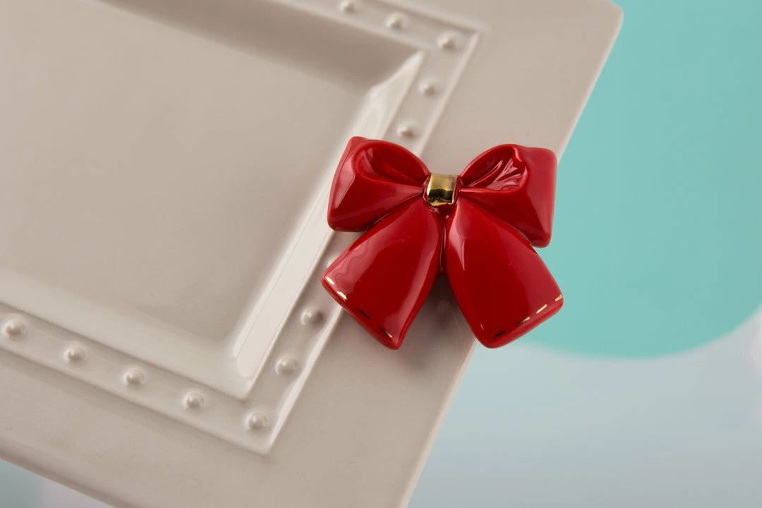 Mini red bow with gold center. Nora Fleming minis can be inserted into Nora Fleming bases and switched out for any occasion or event you may be hosting!